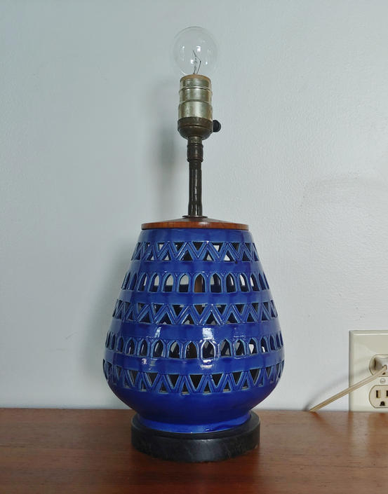 Vintage Royal Blue Ceramic Table Lamp With Cut Out Design By