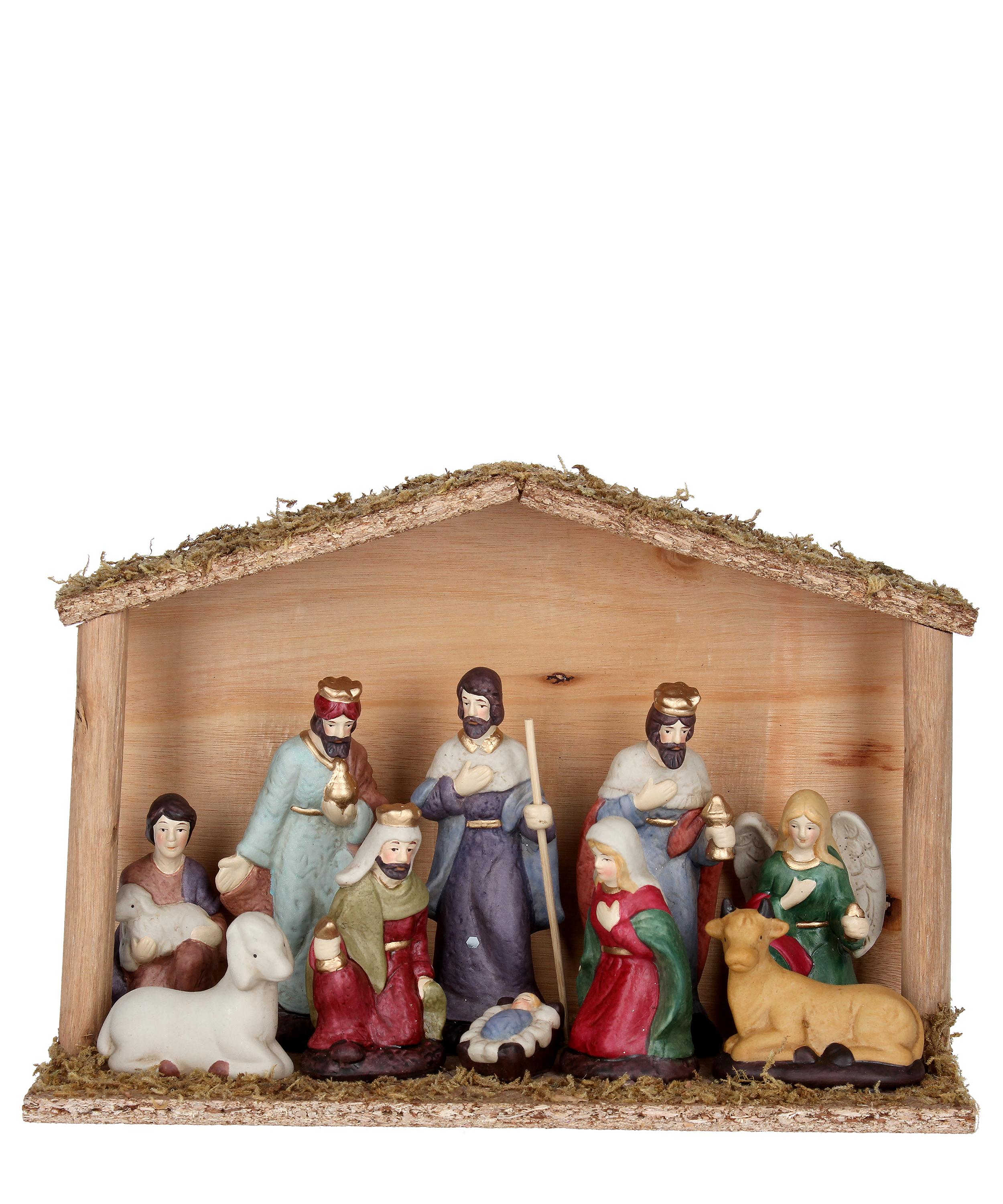 Wood Christmas Crib Nativity Scene With Ceramic Nativity Figures