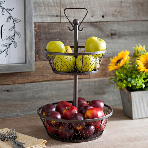 3 Tier Wrought Iron Chicken Wire Basket Stand With Wooden Handle