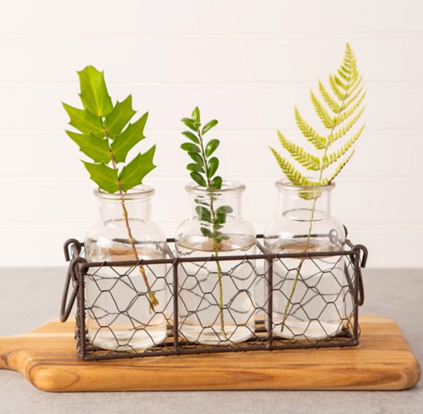 Bud Flower Vases In Wooden Rack With Chicken Wire 4 Piece