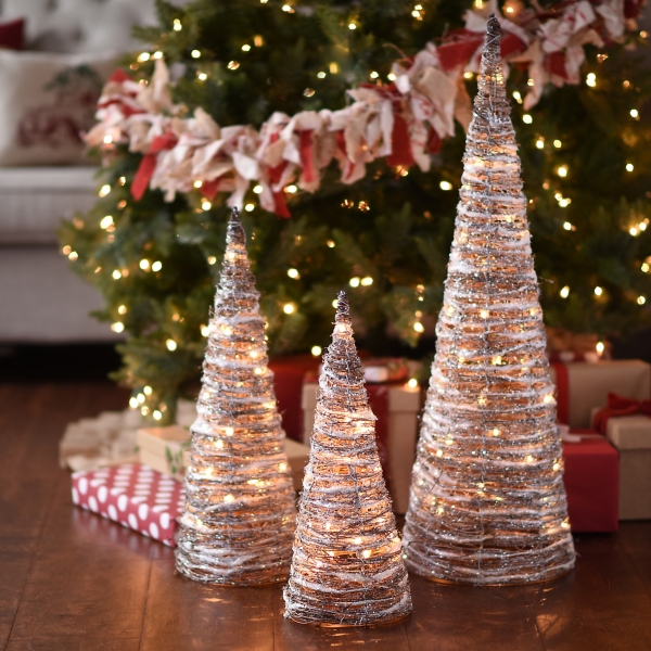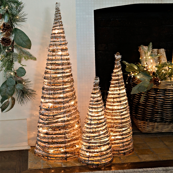 Pre Lit Tinsel Rattan Cone Trees Set Of 3 Kirklands
