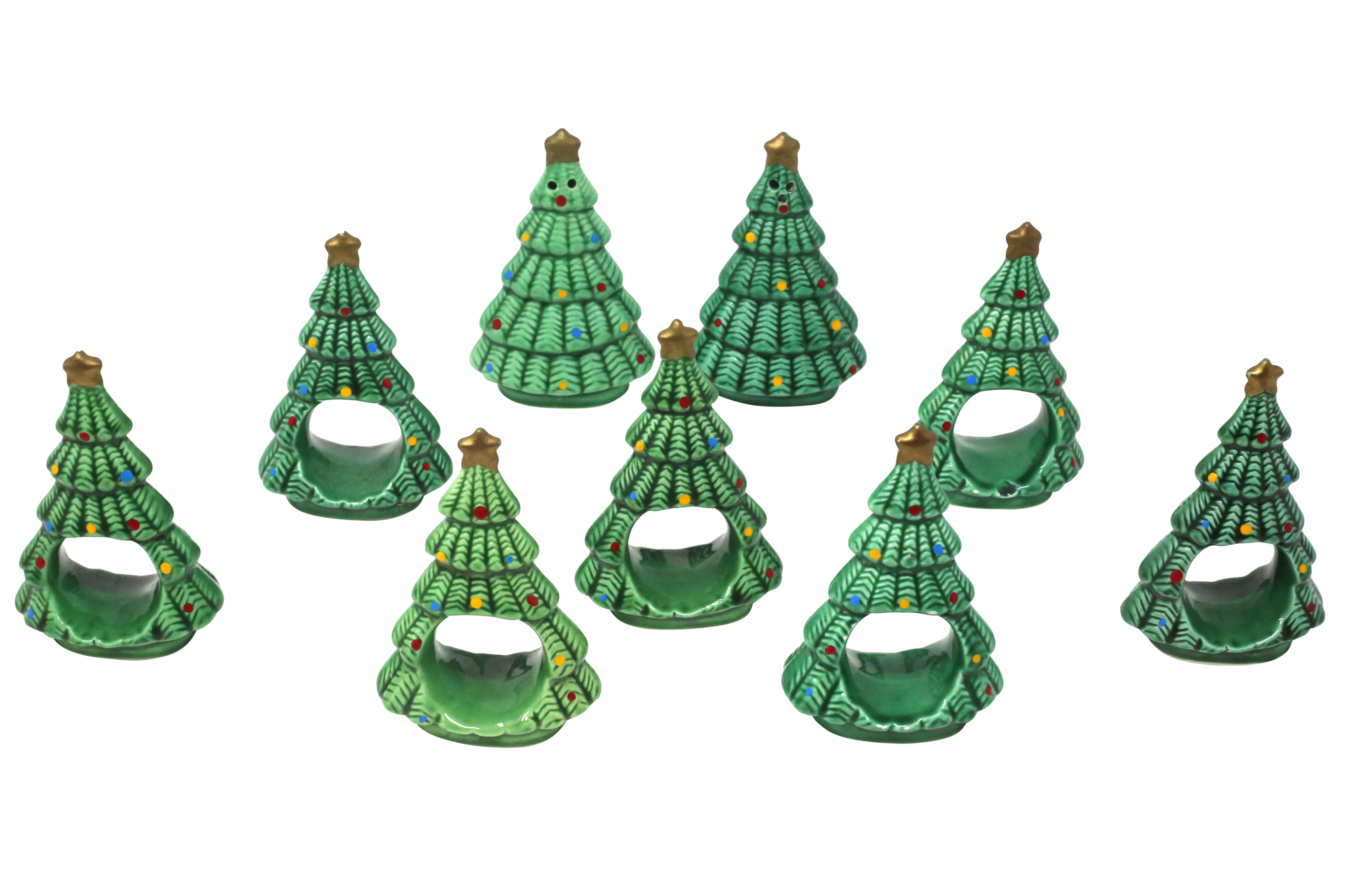 1980 S Ceramic Christmas Tree Napkin Rings And Salt Pepper
