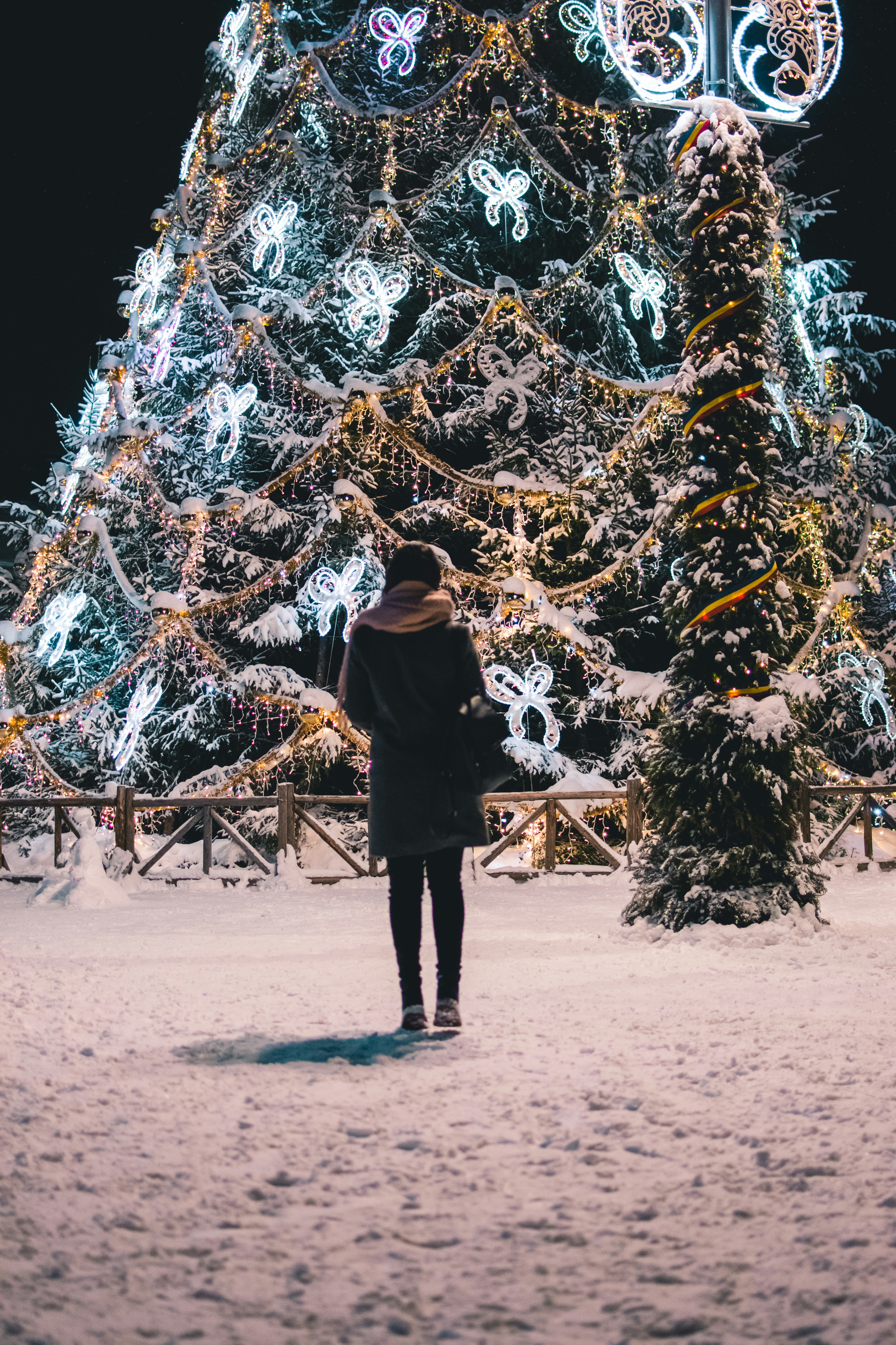Woman Wearing Brown Scarf Across Christmas Tree Photo Free Plant