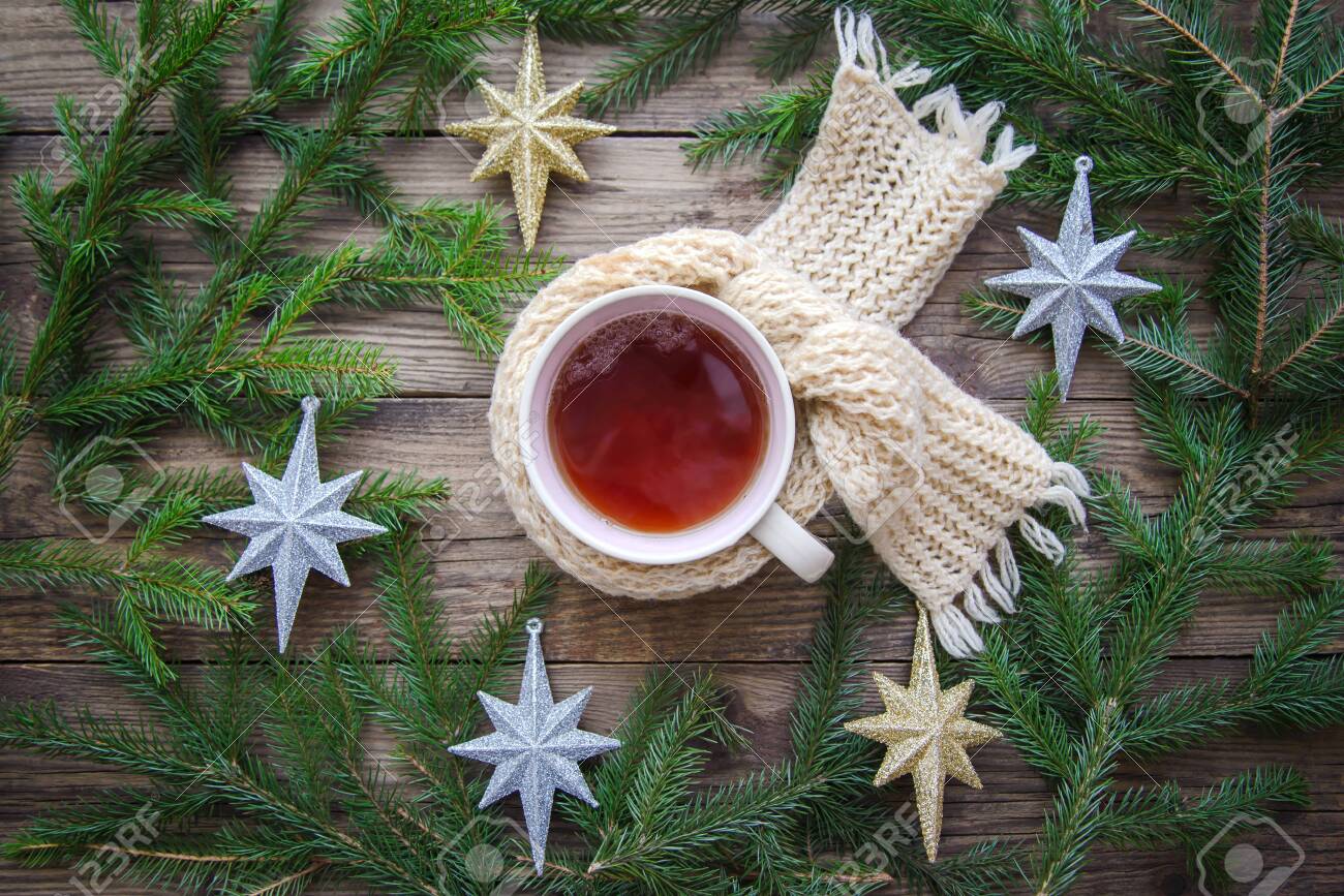 Cozy Picture With A Mug Of Tea In A Scarf Christmas Tree Branches
