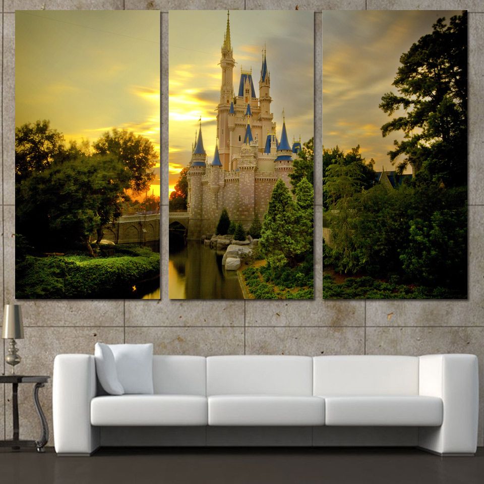 2020 3 Panels Canvas Art Sunset Cinderella Castle Home Decor Wall