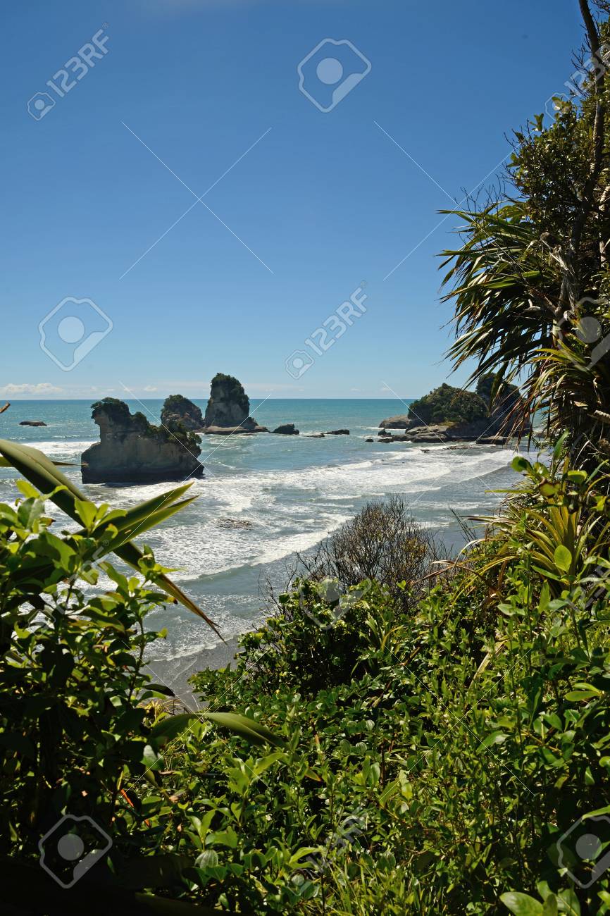Native Bush Frames A Beach At Low Tide On A West Coast Beach